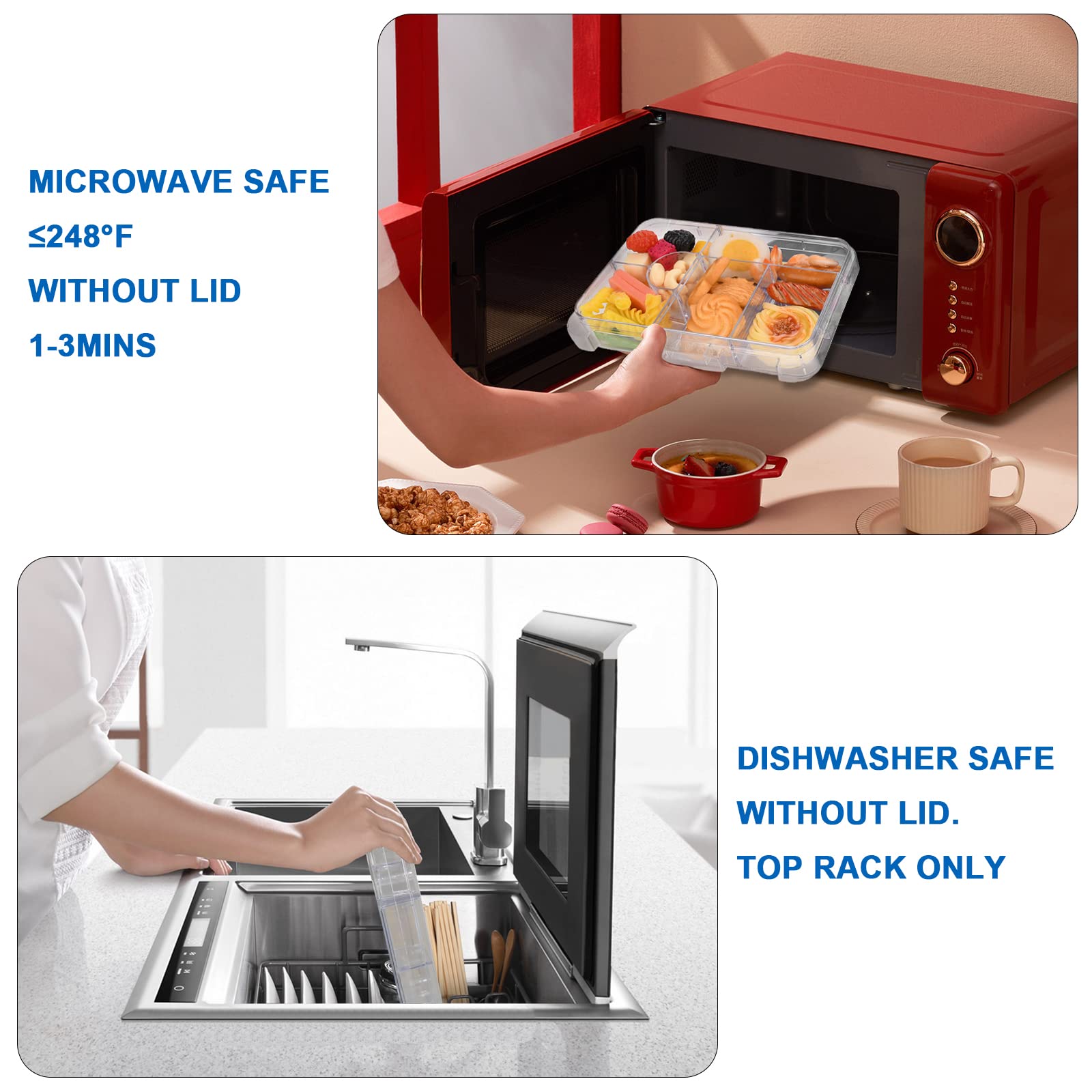 Just pop the compartment tray (Transparent Inner tray) on the top shelf of a dishwasher for cleanup. We recommend hand washing the outer box to preserve the leak-proof seal.