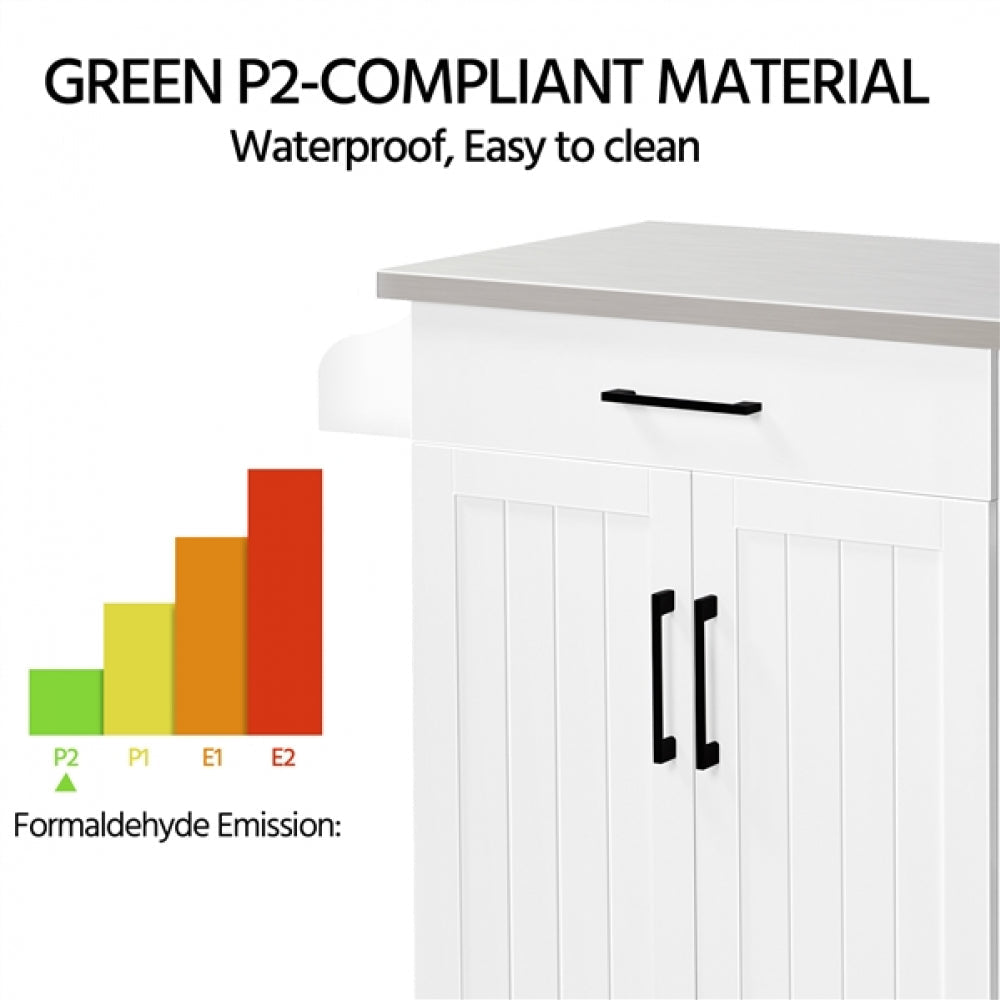Add a bit of extra storage and workspace to your kitchen with this tasteful and functional mobile kitchen island. Crafted from CARB P2-compliant engineered wood base and 0.5mm thick stainless steel countertop, this quality-built kitchen cart sports a clean and elegant finish. The wide drawer stores silverware, bar tools and napkins clean and safe. The towel bar, wine rack and spice rack keep bottles and kitchen towels on hand. The lower cabinet and the open shelves with height-adjustable shelves offer partitioned storage for extra dinnerware or appliances. An easy-to-clean stainless steel countertop gives you extra elbow room as you prep, serve, and stow.