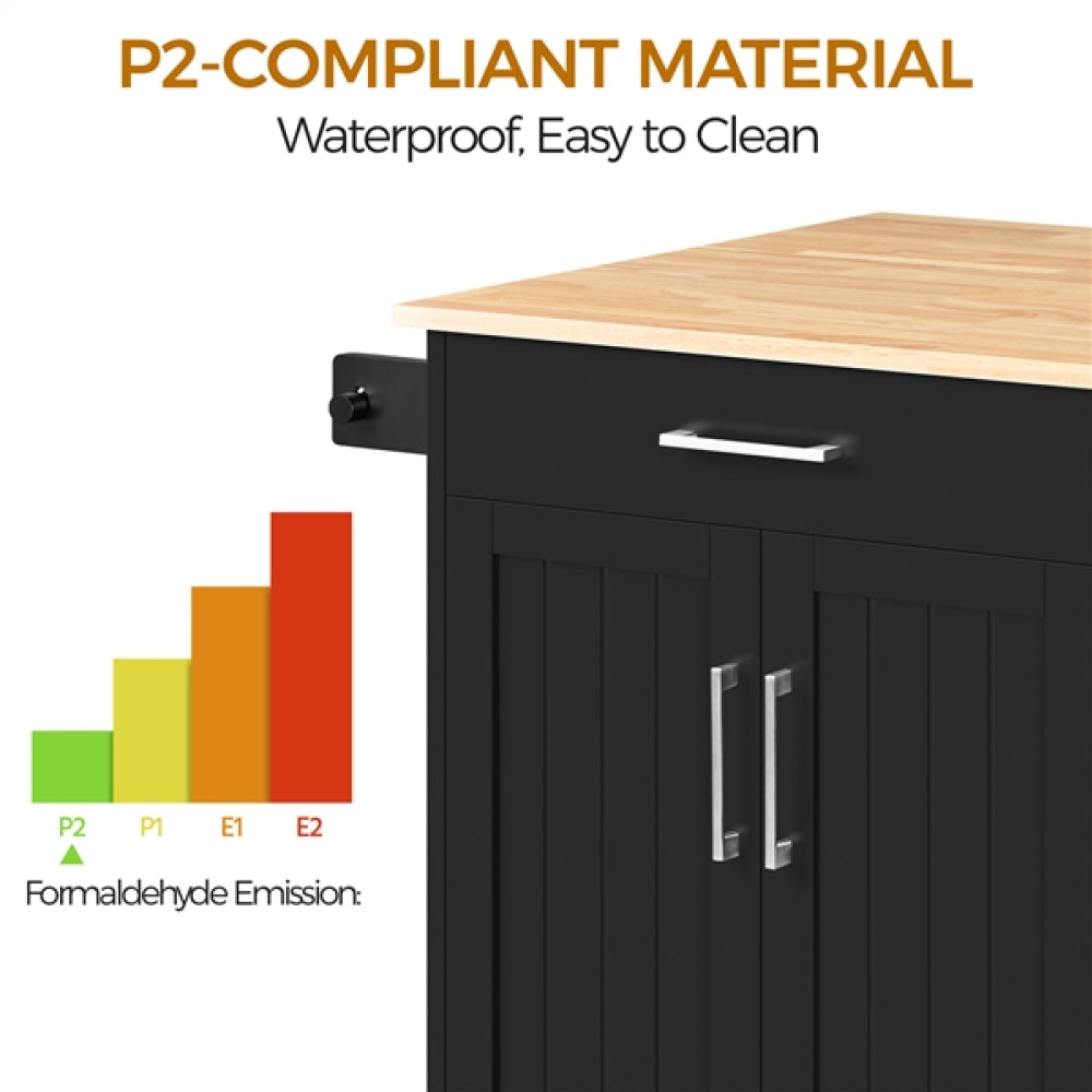 Enhance your kitchen with this stylish and practical mobile kitchen island that adds extra storage and workspace. Constructed from an MDF base with a solid wood countertop, this robust kitchen cart features a sleek and refined finish. The spacious drawer keeps silverware, bar tools, and napkins organized and secure. A detachable towel bar ensures that kitchen towels and paper are always within reach. The lower cabinet has a height-adjustable shelf, while the side open shelves provide partitioned storage for additional dinnerware or appliances. With its easy-to-clean solid wood countertop, you’ll enjoy plenty of elbow room for prepping, serving, and storing.