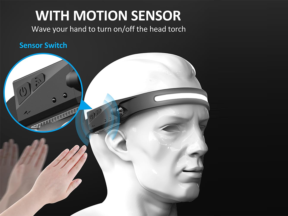 - Motion Sensor Activation — Easily switch the LED Head Torch Headlight Headlamp on/off with a wave of your hand.
