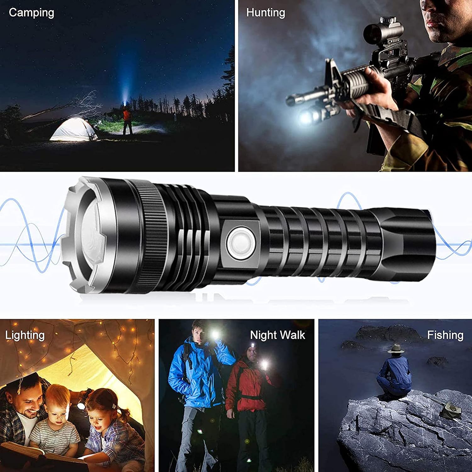 Illuminate your adventures with this rechargeable torch LED, a powerful and versatile lighting solution for both indoor and outdoor activities. Equipped with a P50 LED chip, the rechargeable torch LED delivers ultra-bright output of up to 4200 lumens. With four lighting modes – strong, medium, weak, and strobe flash – and an intelligent retractable zoom function, this rechargeable torch LED allows precise focus or wide-area illumination. Its waterproof, skid-proof design and easy-to-read battery indicators make the rechargeable torch LED perfect for camping, hiking, hunting, cycling, and other outdoor adventures.