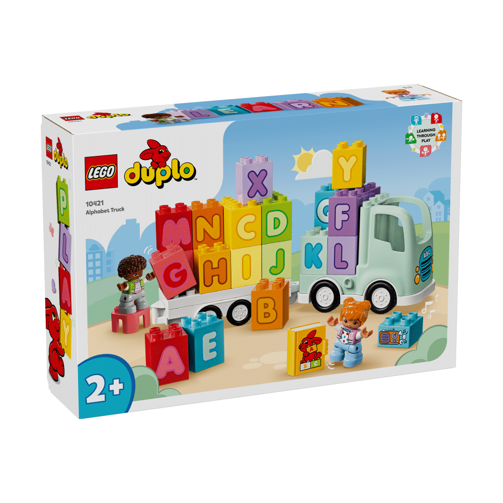 Drive toddler’s letter-learning with the LEGO® DUPLO® Town Alphabet Truck (10421) construction toy for preschool kids. This creative ABC toy delivers lots of playful learning. As toddlers connect the trailer to the toy truck and help the 2 LEGO DUPLO figures load and unload the bricks, they begin to recognise letters, learn colours, improve their language and hone fine motor skills. Imaginative accessories include a LEGO DUPLO ABC book toy element and a stereo element to encourage fun ABC singalongs with parents and toddlers. This educational toy encourages toddlers to invent creative stories as they climb into their toy truck cab and head off for a new adventure! Get toddlers off to great start with LEGO DUPLO construction toys, which put open-ended play, self-expression and learning into toddlers’ hands.