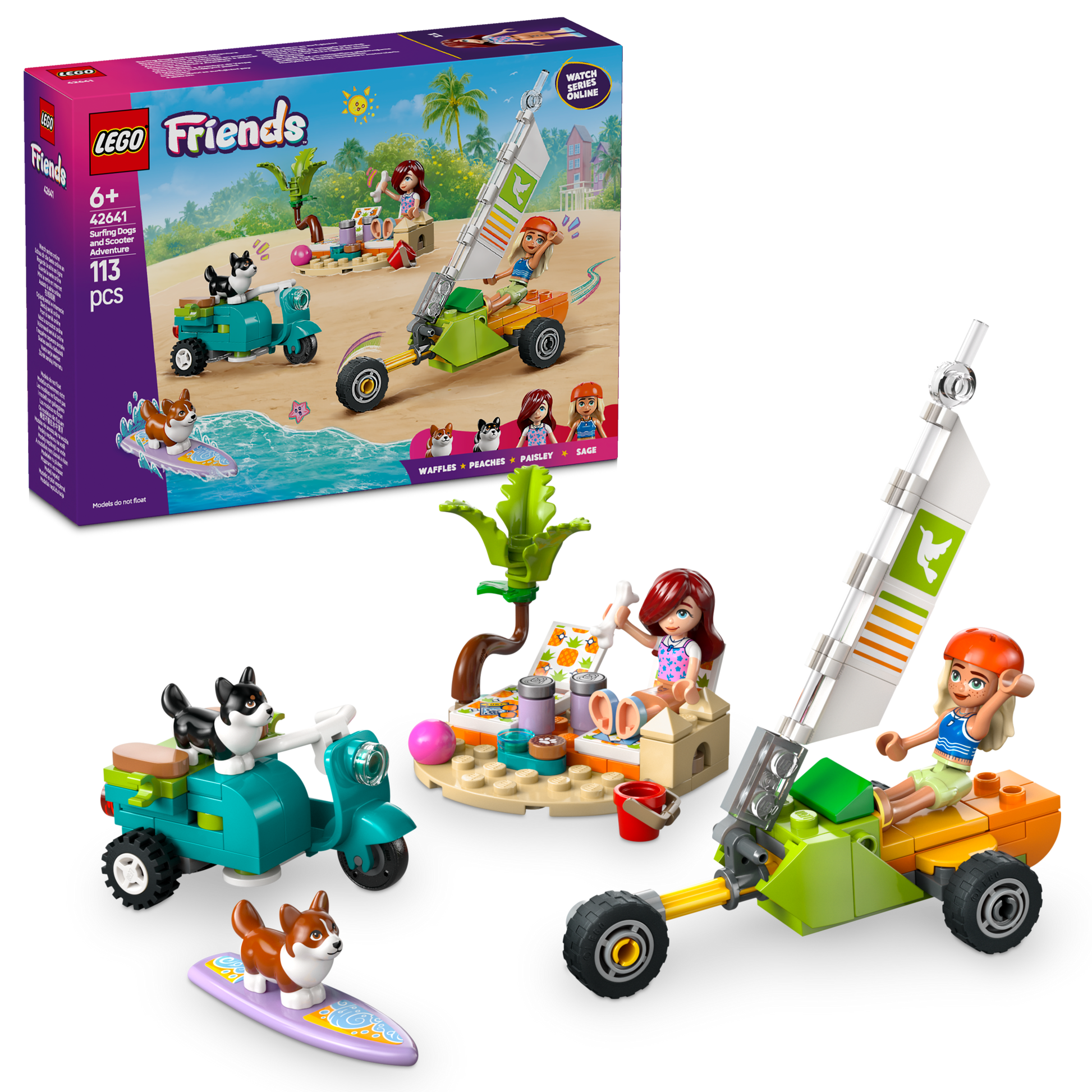 Join the story as Sage and Paisley take their pet corgis to the beach for a day of fun. The friends relax on the sunloungers while the pups take turns riding the surfboard. Then it’s time to take a spin in the scooter or land yacht, where there’s space for a dog to ride too!