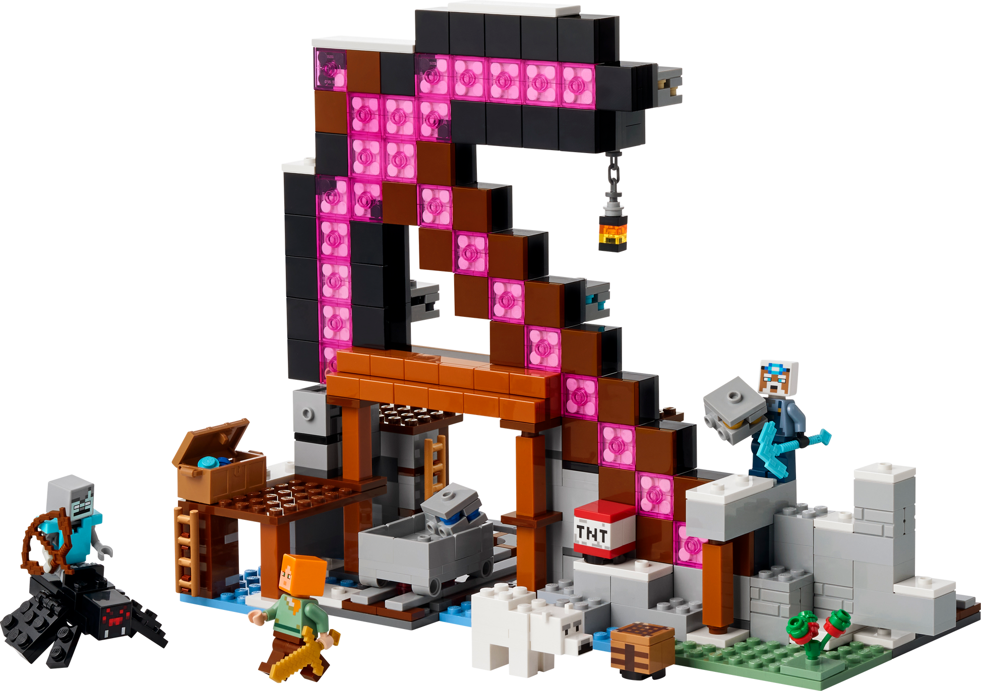 - LEGO® Minecraft® collectible figures – The set includes Alex, Miner and stray spider jockey minifigures, plus a ridable spider and a polar bear figure