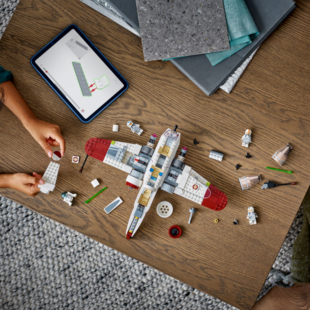 - LEGO® brick-built starfighter – Features 3 opening cockpits, a space for R4-P44, 6 wings, including 4 lever-operated adjustable wings for attack and cruise modes, and 2 spring-loaded shooters