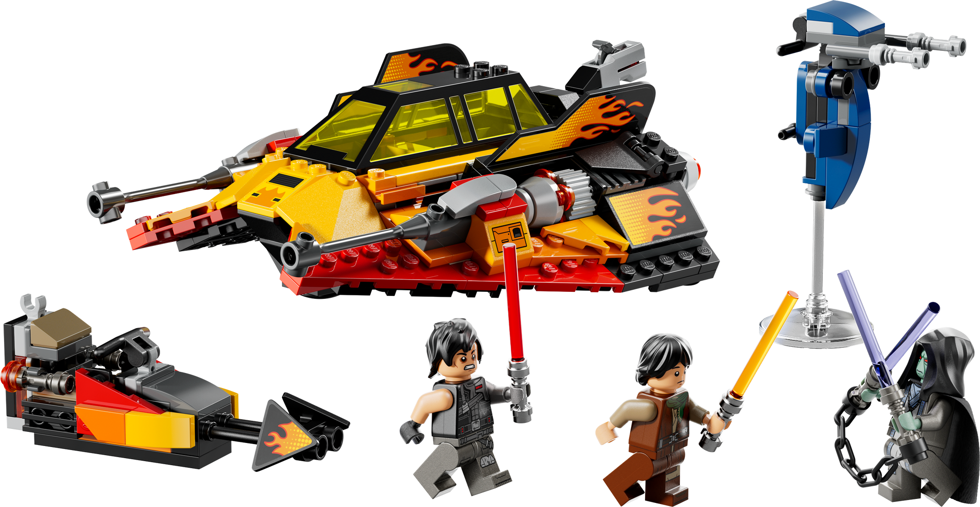 - 2 LEGO® Star Wars™ vehicles in 1 – The Force Burner Snowspeeder features flame decals, an opening double cockpit with a hidden, detachable speeder bike, and a rear stud shooter