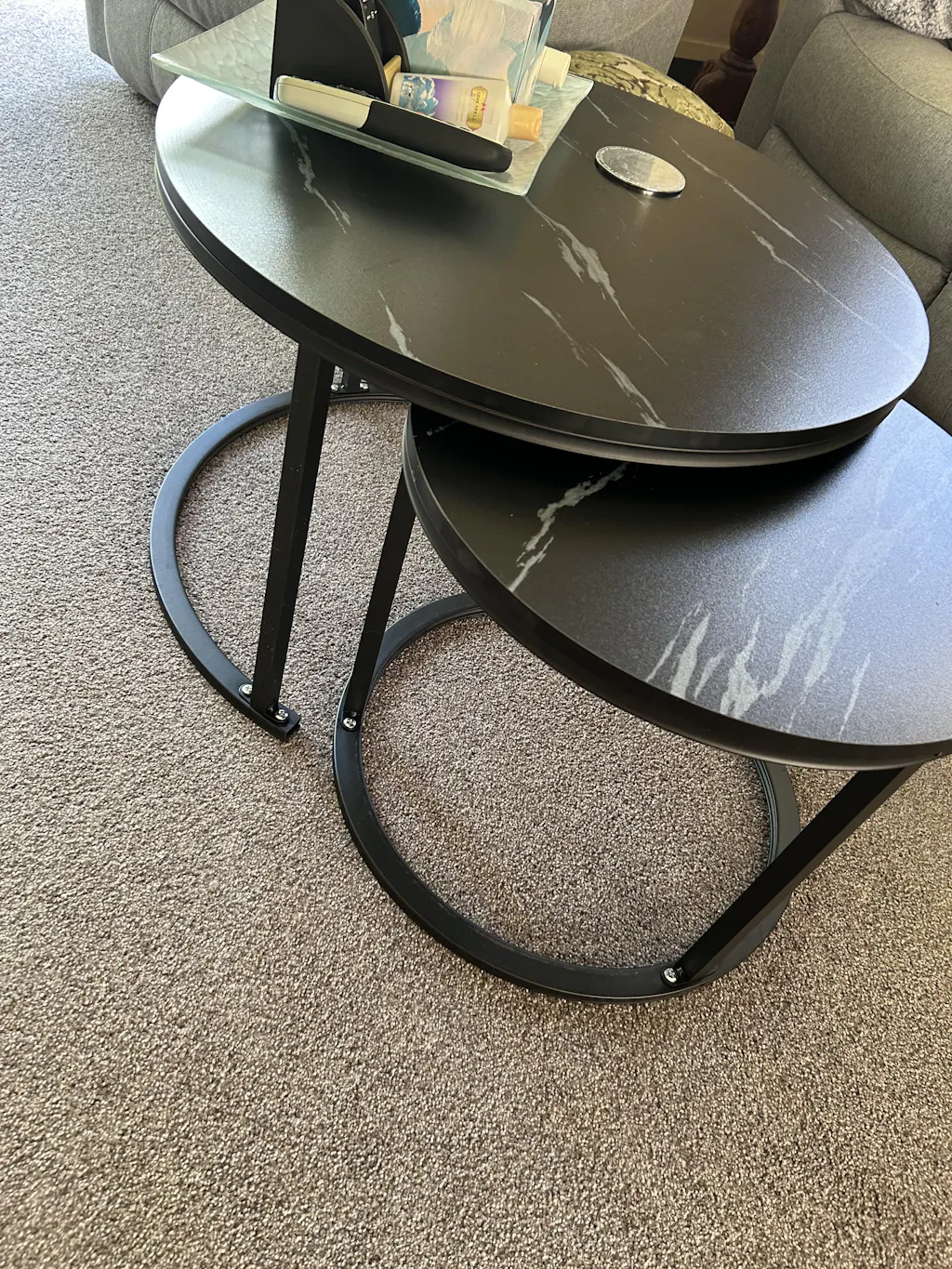 Stacking Tables: Features a set of 2 round side tables—one large and one small—that can be used separately or stacked for flexible use.
