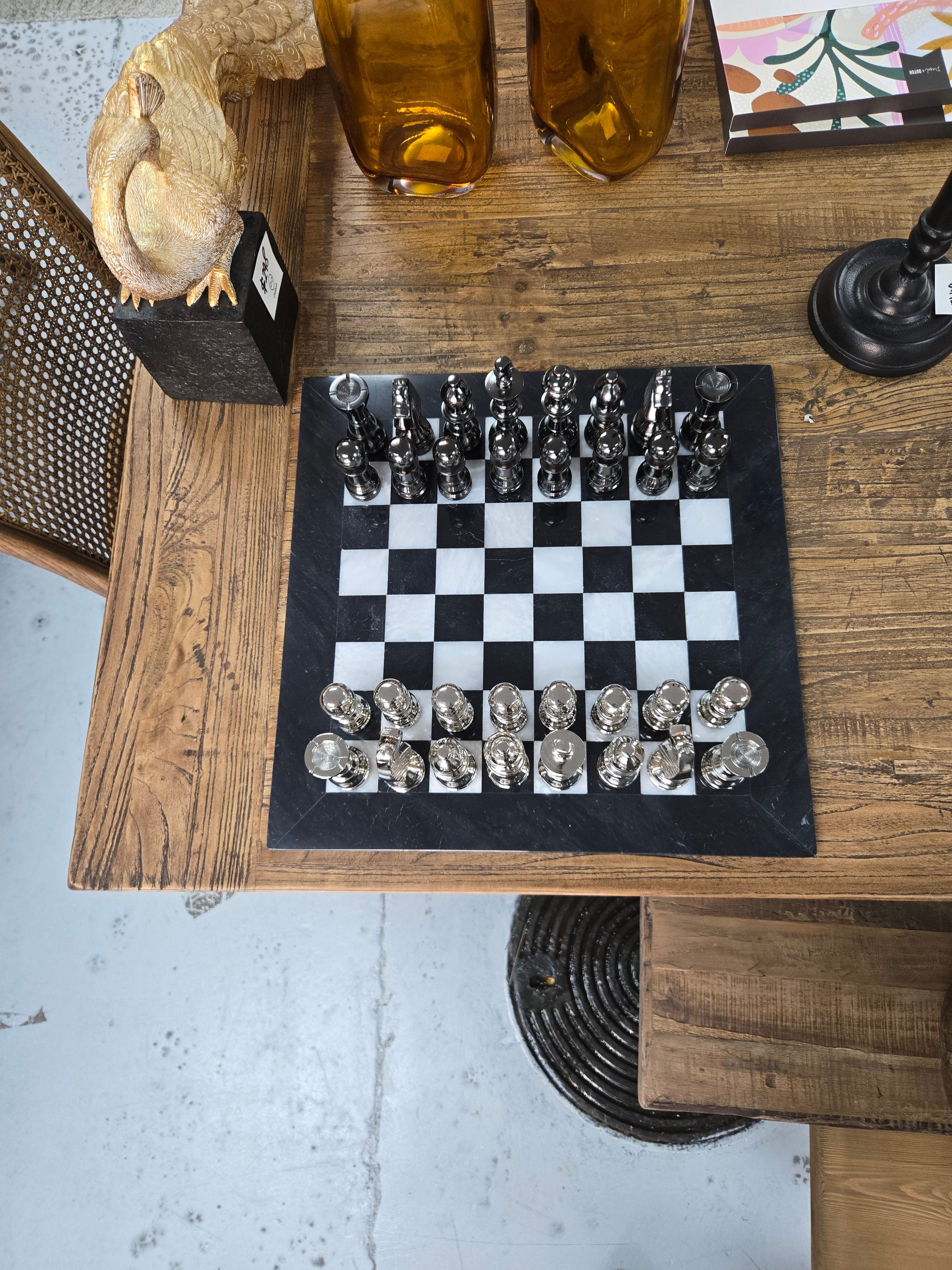 Elevate your game with this large Marble & Aluminium Chess Set, featuring a sleek black and silver design. The polished marble board offers a luxurious playing surface, while the finely crafted aluminium pieces provide durability and a modern aesthetic. Perfect for both serious players and collectors, this set combines elegance with lasting quality.
