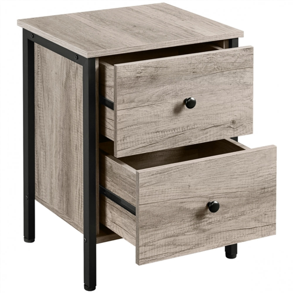 Bring a unique rustic tone to your room with this 2-drawer side table. The matte black iron legs contrast with the wooden top, bringing the piece a sleek but warm tone. Black round knobs embellish the wooden front and subtly echo with the black colored frame for a complete look. Made of P2 grades MDF boards and strong iron materials, this side table is strong and durable for long time use. Two easy pull-out drawers are spacious enough to store your small-scale stuff, and the compact tabletop is perfect to display your flower vase, lamp, family photo frame, book, etc. Ideal for the living room, kitchen, office, apartment, dormitory and any place that needs storage