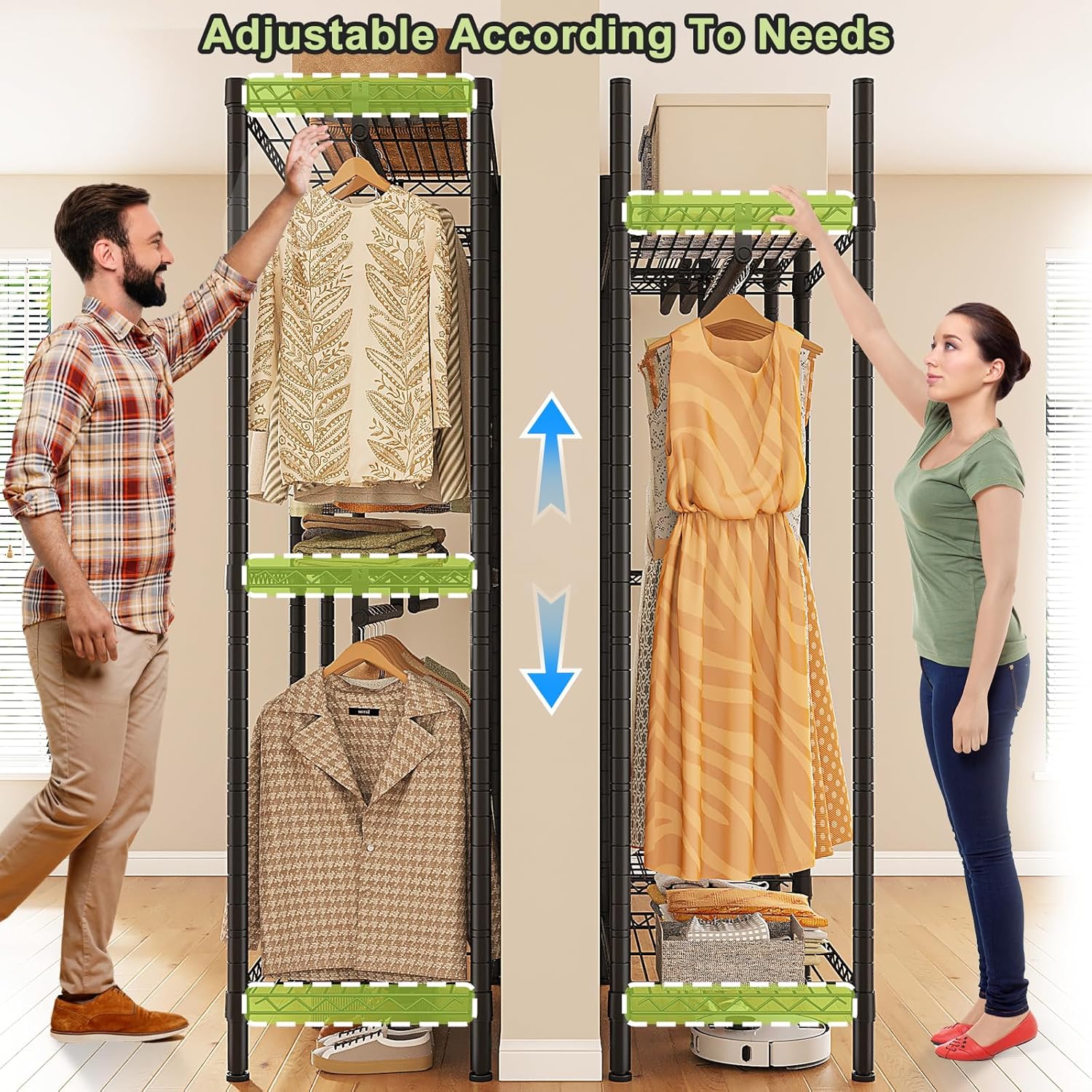 Easily reposition shelves and hanging rods to suit your wardrobe. Hang suits, long dresses, jackets, or shirts, and store shoes or folded items with ease. Great for creating double-hang or long-hang storage options. -