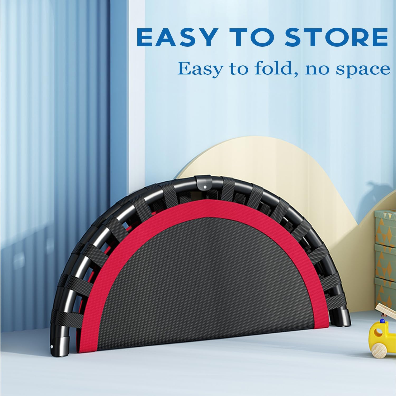 - Foldable & Portable: Easily store the Mini Trampoline Rebounder under a bed, in a cupboard, or take it on the go.
