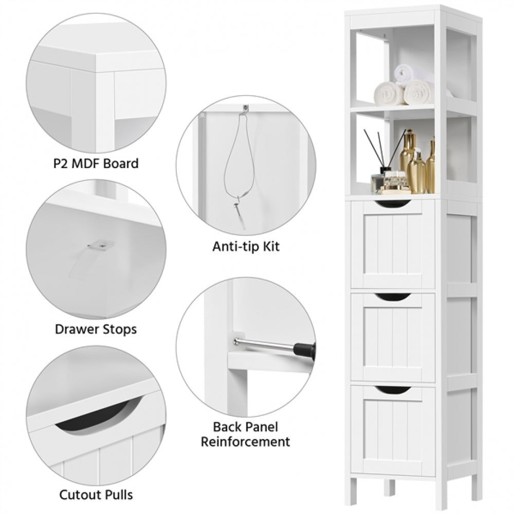 Looking for a practical bathroom cabinet without taking up too much floor space? This tall and slim free-standing cabinet is the pick! A clean-lined design combined with slatted paneling makes this cabinet modern and sleek, which works well in a variety of aesthetics. It is made of selected material and will be safe for you and your family. The 2-tier open storage is suitable for holding decorations or bathroom necessities. And, the lower three drawers with cutout drawer pulls are ideal for storage, providing good protection against dust and dirt. Included wall mounting hardware and back panel fixtures help to improve stability and safety. You can use it in the bathroom, living room, bedroom, laundry room or office as you need.