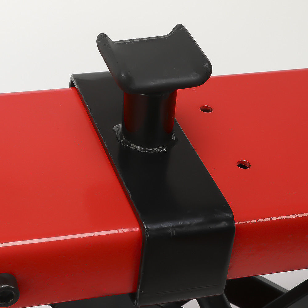 This stand can be used alone or with most motorcycle lift. It is made of solid carbon steel with red and black powder coated finish, firm and durable. Many repair shops use such lifts to bring the vehicle off of the ground and up to a level, so that the mechanic does not have to put any strain on his or her back or lay upon the ground to perform any kind of work upon the vehicle. It has Two variable screw adapters and a removable crank handle, just simple crank operation. Such a practical tool, you will like it.