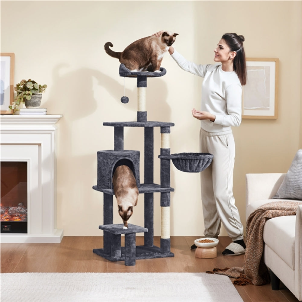 Specifications Materials: Particleboard, Plush, Sisal Rope, Plastic Color: Dark Gray Assembled Dimensions: 48.5 cm L × 40.5 cm W × 145 cm H Baseboard: 48.5 cm L × 40.5 cm W Cylinder Condo: 31 cm Dia. × 26 cm H; Entrance: 18 cm W × 20 cm H Basket Diameter: 30 cm Polygonal Platform: 40.5 cm L × 40.5 cm W Cat-ear-shaped Perch: 30 cm Dia. × 15 cm H Small Platform: 30 cm L × 24.5 cm W Maximum Weight Capacity Basket: 5 kg / 11 lb Condo/Perch: 10 kg / 22 lb Item Weight: 9.2 kg / 20.3 lb Shipping Weight: 9.9 kg / 21.8 lb