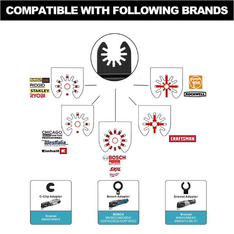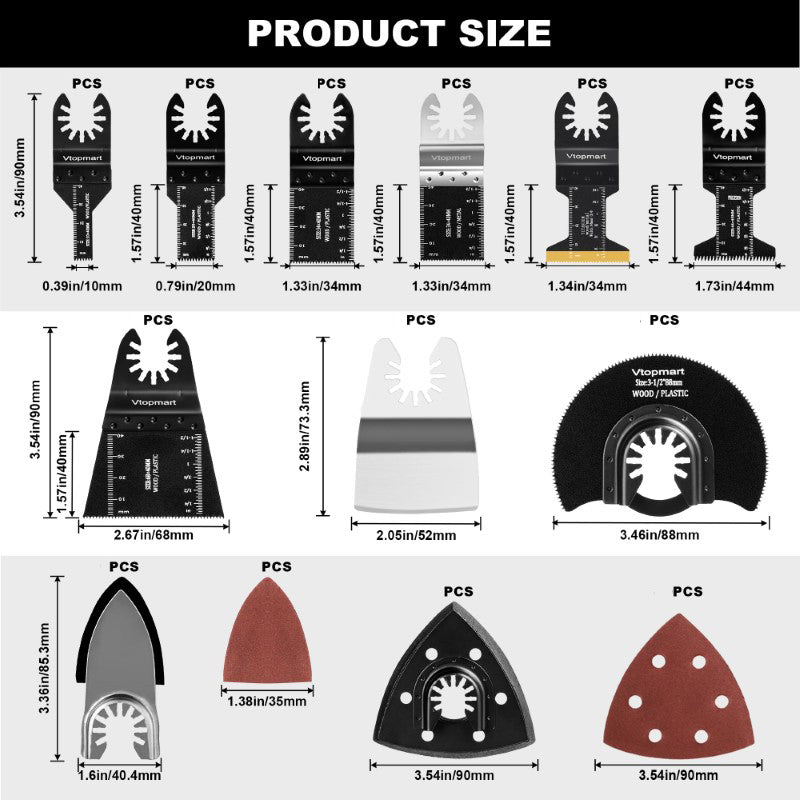 - 98PCS Oscillating Tool Blade: Includes 98 tool accessories, including 8 different types of blades, such as HCS blades, bi-metal titanium blades, semi-circular blades, stainless steel curved blade, sand tray, various sandpapers, and three adapters. This set is ideal for home repair or renovation work.