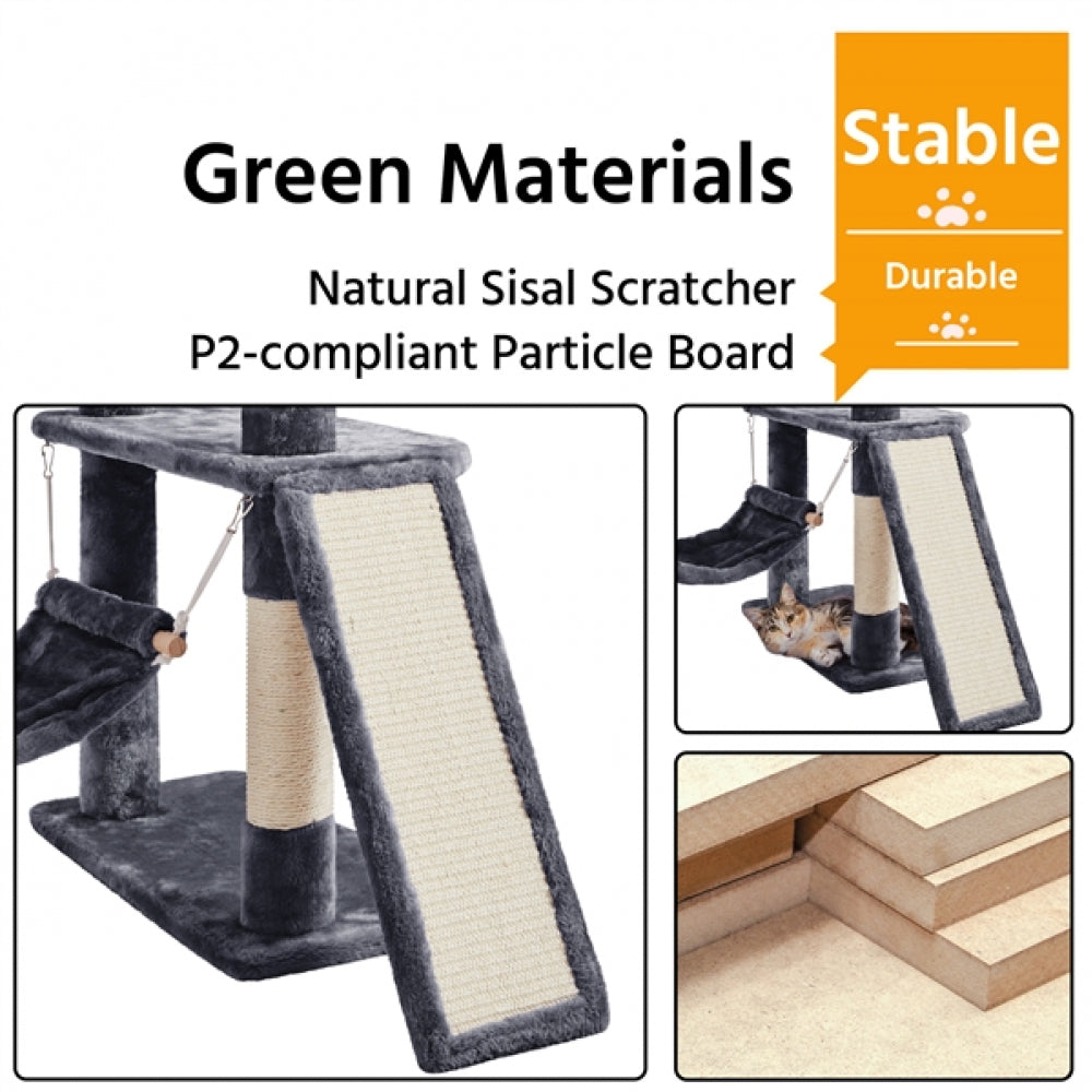 Buy your cutest cats this tall cat tree, and they will be happy forever! The cat tree condo is constructed of quality particle board, natural sisal, and skin-friendly soft plush fabric covering. This multi-level cat tree condo can accommodate 2-3 medium/large cats with a comfy plush perch, a roomy cubby, soft hammock, and basket as their lounging/napping spots, and multiple scratching posts to sharpen their claws. Jumping from tier to tier, punching the dangling ball, scratching on the posts, taking a little nap on the perch or in the hammock/basket…with this cat tree, your little furry buddies will be the happiest kittens in the world. No more hesitation!