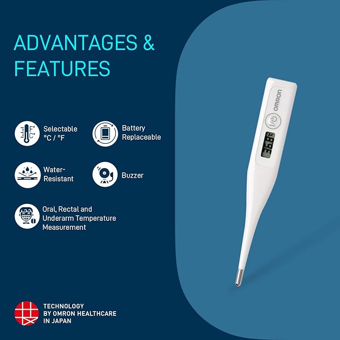 Omron’s MC-246 delivers medical-grade accuracy with user-friendly features, making it ideal for home, travel, or clinical use. Its 60-second response time, dual-scale display (°C/°F), and water-resistant design ensure reliable temperature monitoring for all ages.