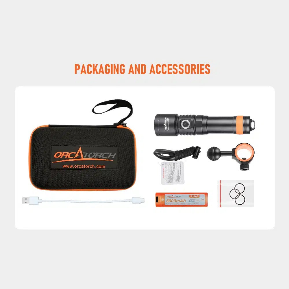 - Whether you’re a recreational or a professional diver, you’ll find the ORCATORCH D710 dive light useful in your underwater activities. With max 3,000 lumens, the D710 is one of the strongest torches in its class. But, you have plenty of brightness settings to choose from if you prefer less power. It runs on one OrcaTorch 21700 5000mAh rechargeable battery with Type-C charging port, easier for you to charge it anywhere.