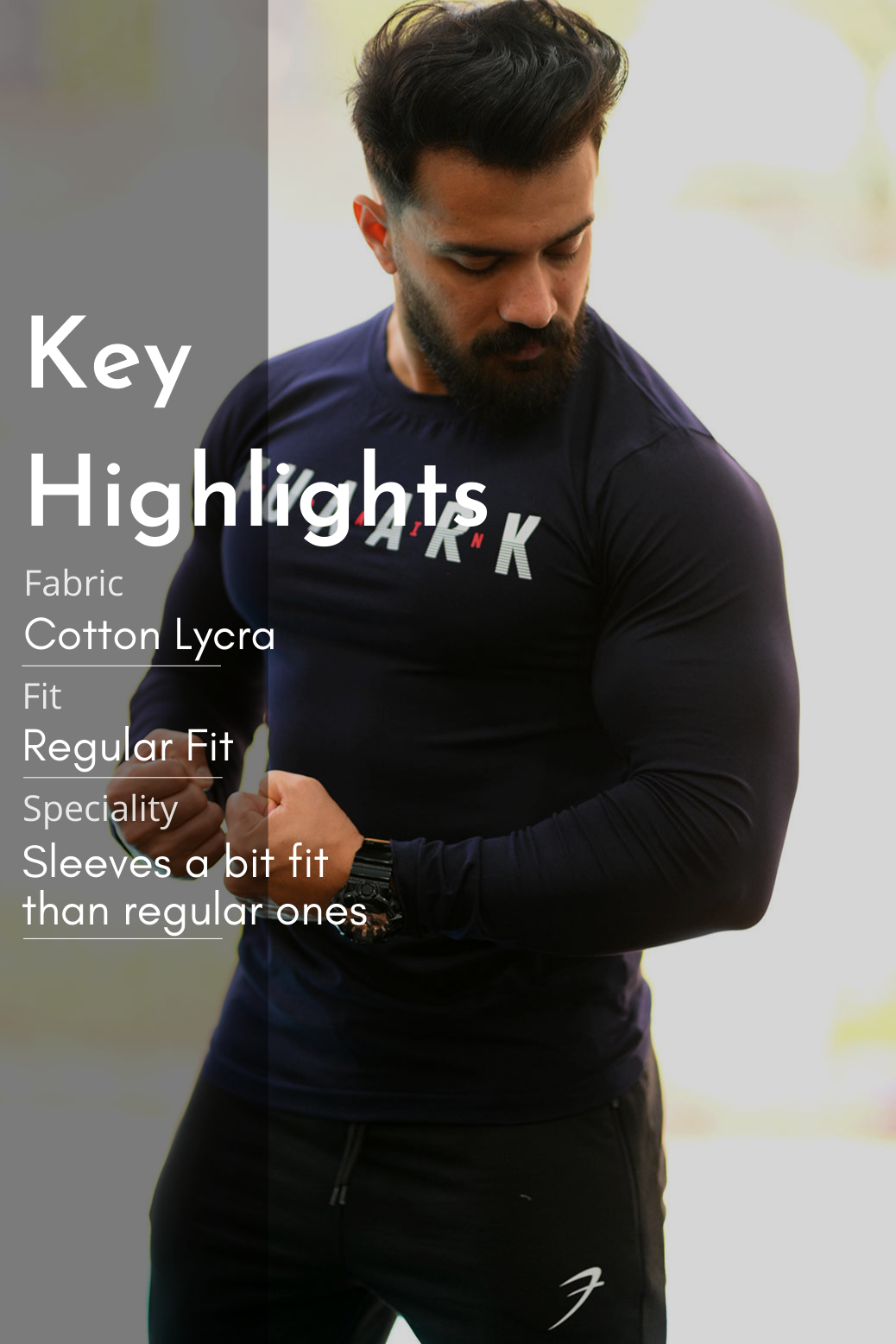 Elevate your casual style with the Peak Full Sleeve T-shirt in Navy. Crafted with a body fit, this t-shirt hugs your body in all the right places, providing a flattering silhouette. The perfect fit from shoulders and arms ensures that you look sharp, with no bagginess, allowing for a smooth and streamlined appearance. Made with high-quality 200gsm cotton, it offers both durability and breathability, ensuring all-day comfort. Whether you're out for a casual outing or working up a sweat, this navy full sleeve t-shirt is an essential piece for anyone looking to add style and comfort to their wardrobe.