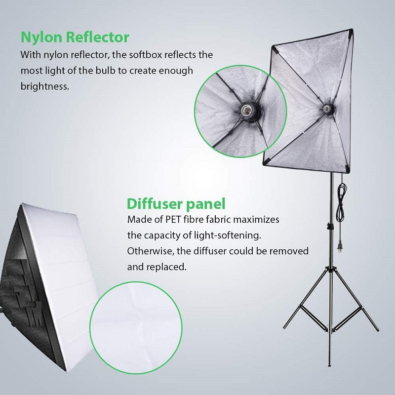 (2)24"X24"/60x60cm Soft box: Soft box diffuses the light and gives you perfect even lighting when you need for the best shots possible. With E27 socket, you can directly connect light bulbs, fluorescent lamps, or slave flash to offer the light.