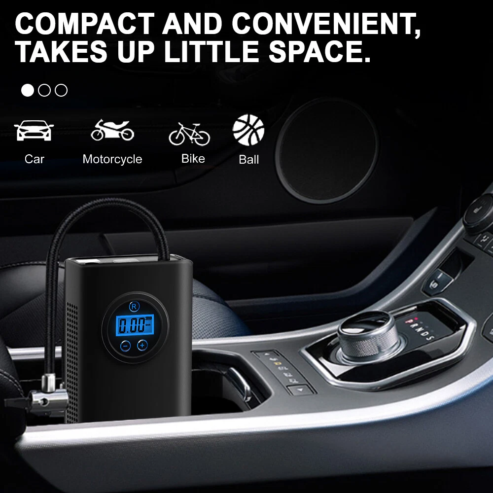 The Portable Air Compressor Pump delivers quick and reliable tire inflation anytime, anywhere. Designed with dual 1500mAh batteries and a powerful motor, this Portable Air Compressor Pump fills tires in seconds. With its compact size, multiple inflation modes, and clear LCD display, the Portable Air Compressor Pump is perfect for cars, bikes, motorcycles, and more.