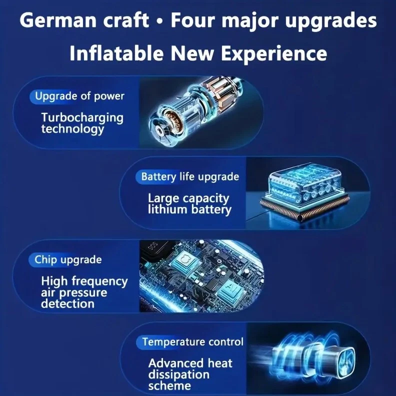 - Heat Dissipation System — Advanced dual-network cooling and a 7-blade fan keep the Portable Air Compressor Pump running longer without overheating.