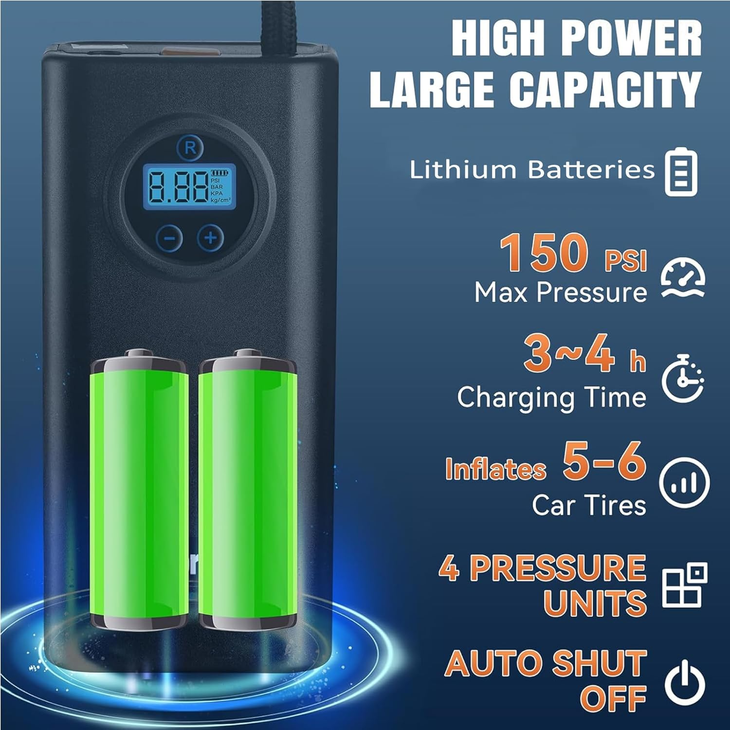 - High-Power Performance — The Portable Air Compressor Pump uses a pure copper motor for fast inflation, reaching 150 PSI in just seconds.