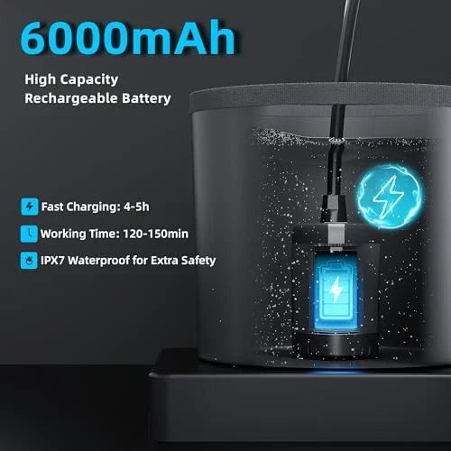 - High-Capacity Rechargeable Battery: Powered by a 6000mAh battery, the Portable Camping Shower provides 120–180 minutes of continuous operation. The Type-C charging interface supports power banks, laptops, car USB ports, and mobile chargers.