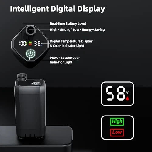 - Intelligent Digital Display: The Portable Camping Shower features an LED screen showing battery level and real-time water temperature (32–140°F). Colour indicators help prevent overheating and sudden power loss.