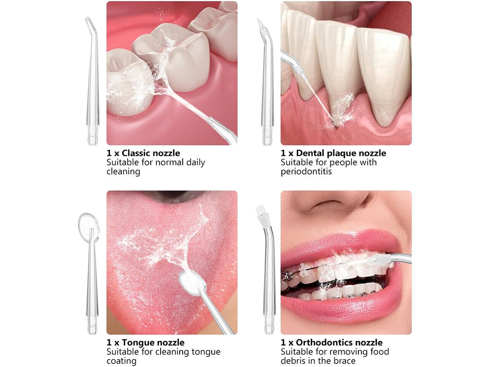 Nozzles: 4 Pcs (2 standard nozzles, 1 orthodontic nozzle, 1 tongue scraper)