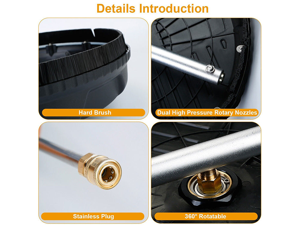 Heavy Duty Materials:Made of heavy duty brass,stainless steel and durable hard composite construction,our Power Washer Surface Cleaner is durable enough for long using.