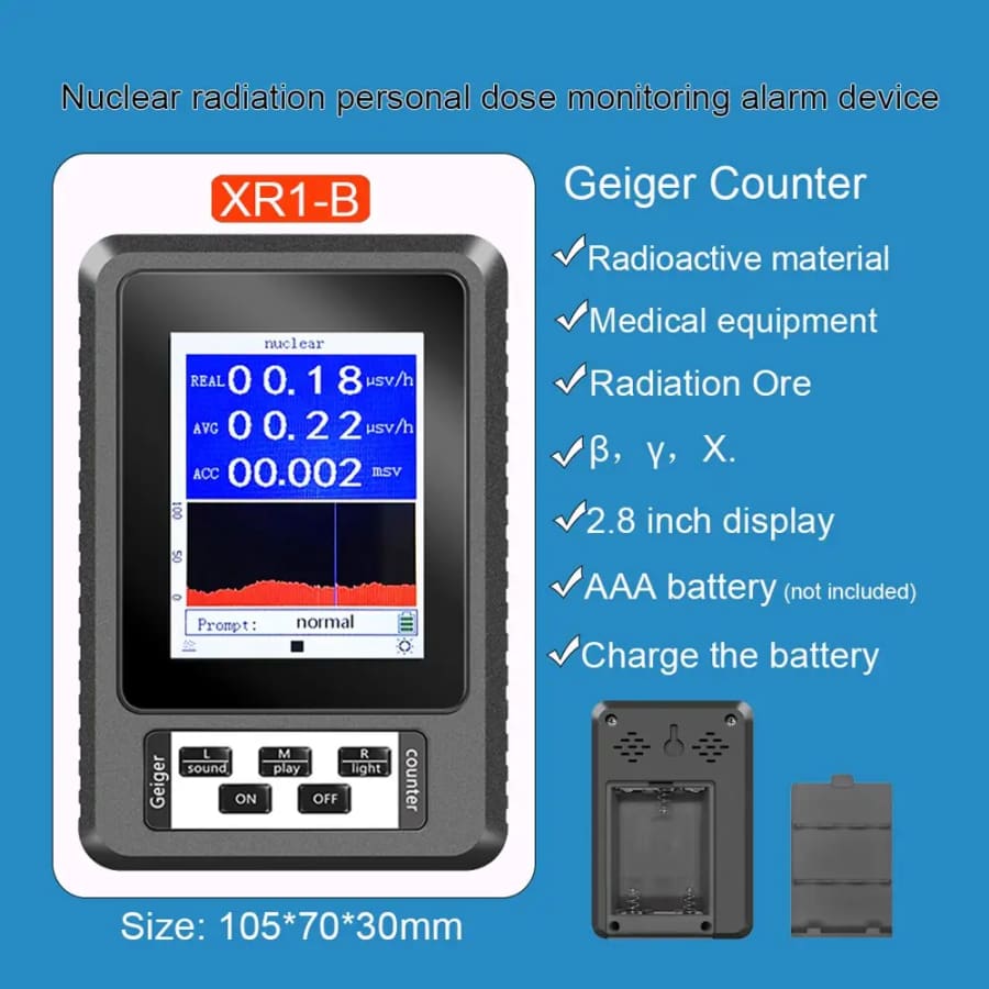 The XR1 Radiation Detector Geiger Counter is a portable, easy-to-read device designed for real-time monitoring of nuclear radiation.