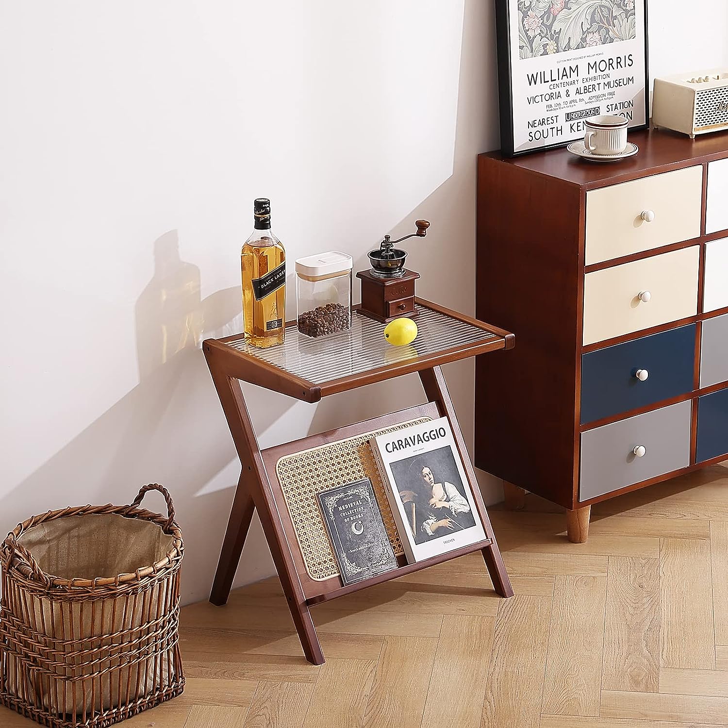 - Rattan shelf used for newspapers and magazines, combining modern and Bohemian elements for a stylish and practical room.