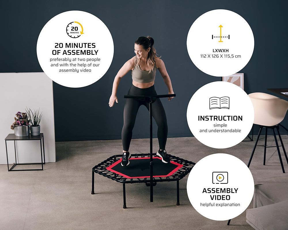Elevate your home workouts with our state-of-the-art Indoor Trampoline, the perfect Rebounder for Home Fitness. This Adjustable Fitness Trampoline serves as a Quiet Indoor Trampoline for uninterrupted exercise, offering a smooth, Low Impact Cardio Trampoline experience. Featuring a 51-inch Trampoline with Bar for enhanced support, it excels as a Home Rebounder Trampoline that's both a Joint-Friendly Trampoline and an ideal Fitness Trampoline for Small Spaces. Complete with an Adjustable Handrail Trampoline design and a vibrant finish as a Red Trampoline for Home Use, it's the ultimate blend of style, safety, and functionality for your workout routine.