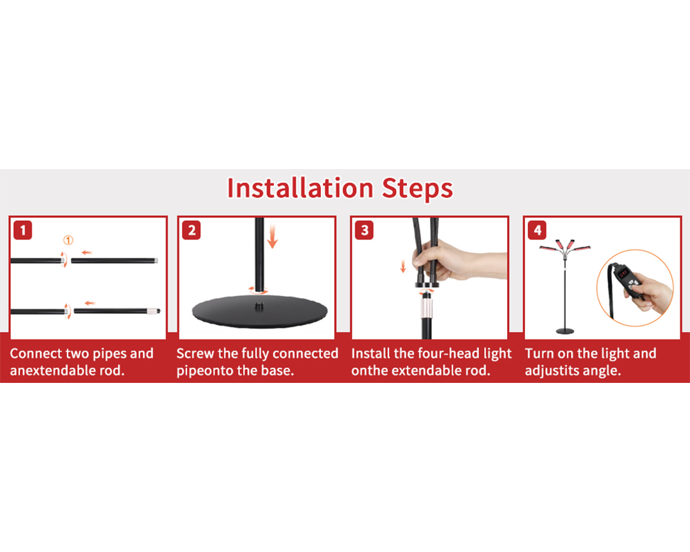 The Red Light Therapy Lamp comes with a flexible gooseneck and telescopic pole adjustable from 13 to 52 inches, making the Red Light Therapy Lamp suitable for all heights and both facial and full-body use.