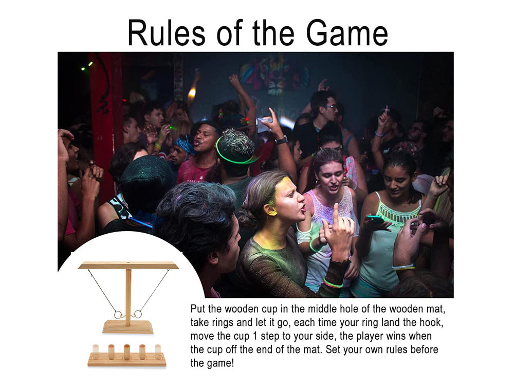 Classic Hook and Ring Game: Players attempt to land a ring attached to a string onto a hook screwed to a central post. The objective is to remove the ring and move a small cylinder towards your opponent each time you successfully hook the ring. The first player to remove the cylinder from the end of the ladder wins!