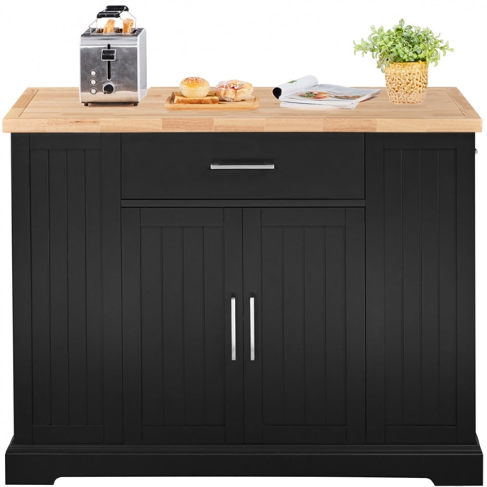 Kitchen islands play a vital role in maximizing food preparation space, particularly in compact kitchens. Constructed from E1-compliant engineered wood and featuring a robust rubberwood desktop, this kitchen island excels in both durability and strength. It features a spacious desktop, a large drawer, two side drawers, a roomy cabinet, and two side open shelves, delivering expansive storage options for your kitchen essentials. With a total weight capacity of 230 kg and a counter space maximum load of 80 kg, this contemporary kitchen storage unit ensures ample support. Better yet, the kitchen island has four hidden casters for effortless mobility, allowing it to move to any desired location smoothly.