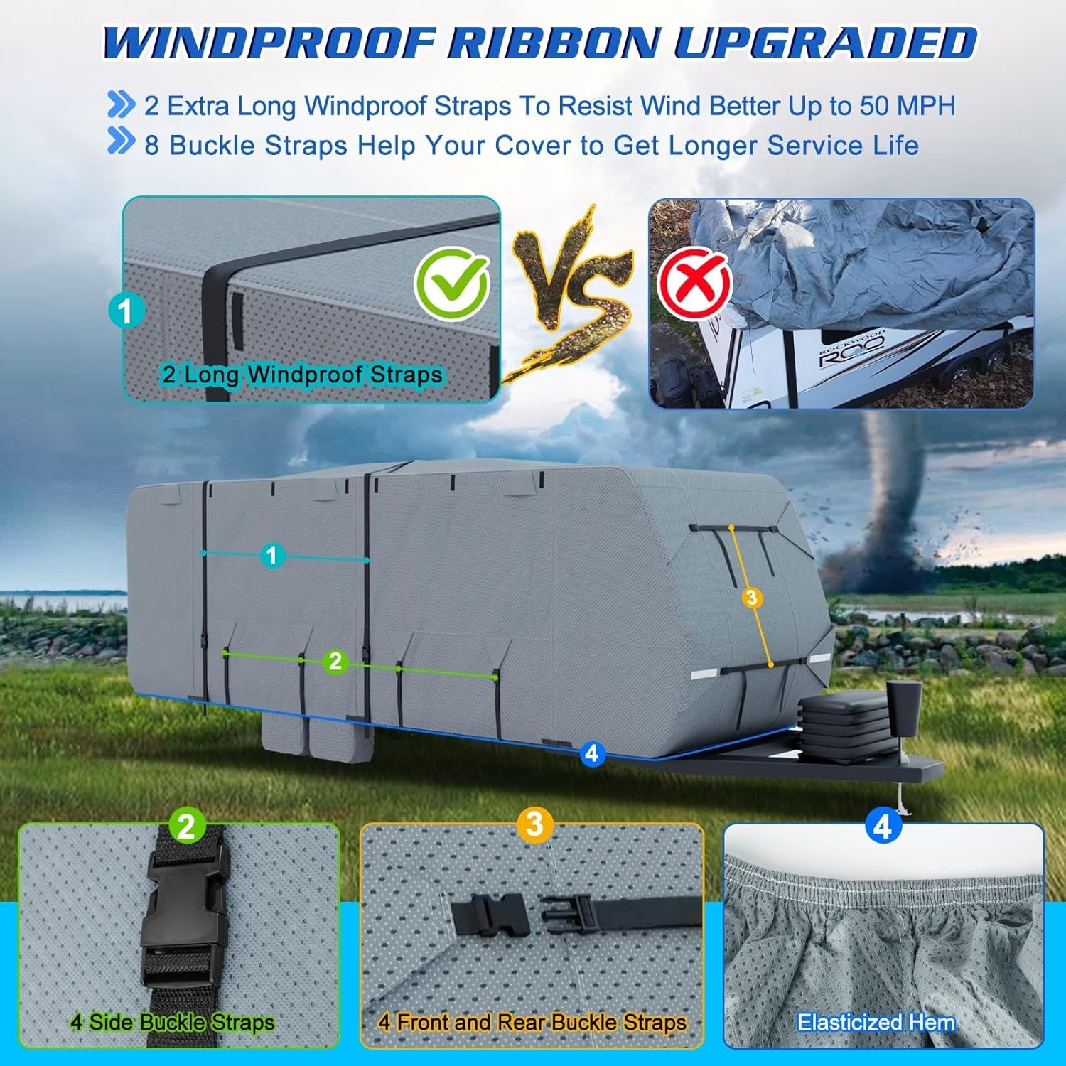 - Secure Windproof Fit: Elasticated hem, adjustable straps, and Velcro tapes keep the RV Cover firmly in place.