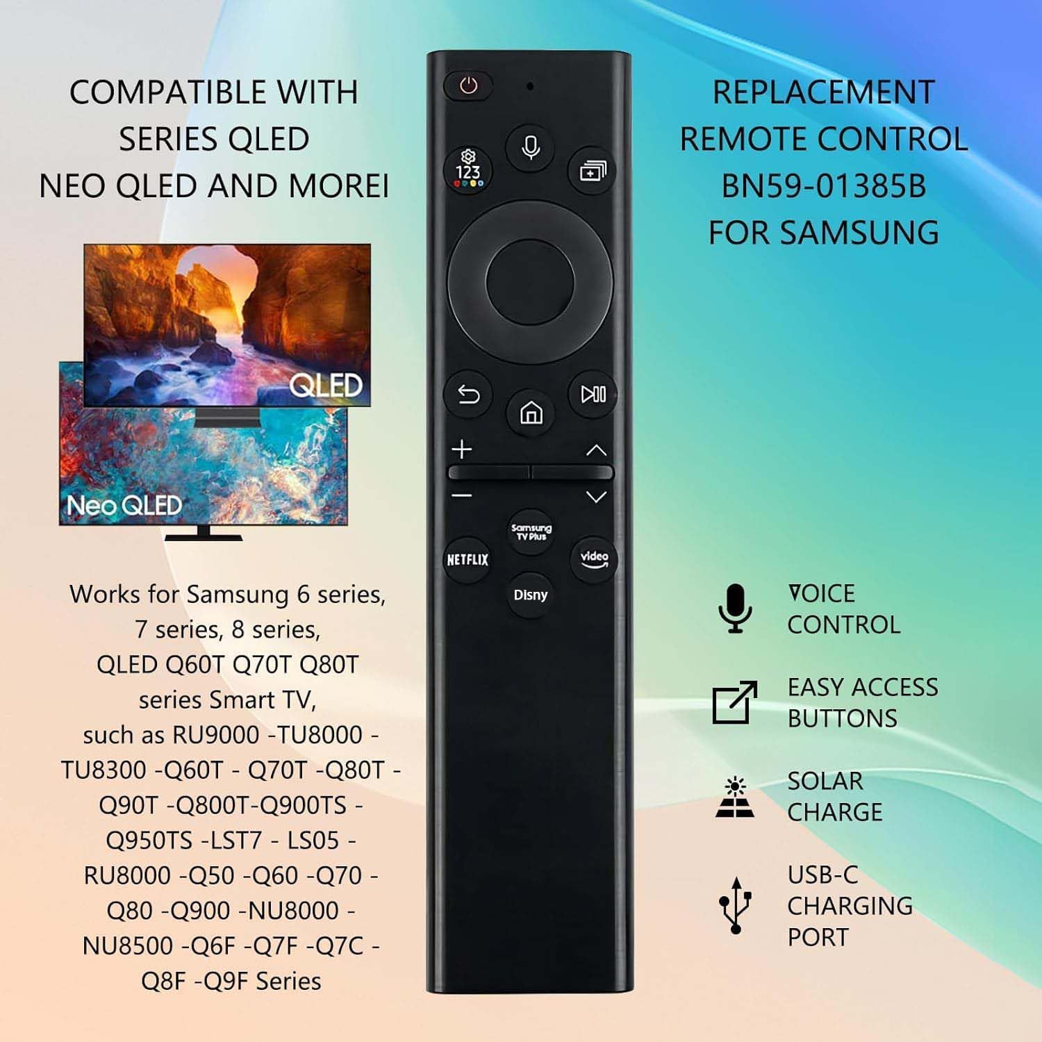- BN59-01385A/BN59-01385B for Samsung smart tv remote replacement is designed to work seamlessly with most T 2018 to 2022 MODELS, such as Samsung 6 series, 7 series, 8 series, QLED Q60T, Q70T, Q80T series Smart TVs, RU8000, RU9000, TU8000, TU8300, NU8000, NU8500, Q60T, Q70T, Q80T, Q90T, Q900TS, Q950TS, LS07, LS05, Q50, Q60, Q70, Q80, Q900, Q6F, Q7F, Q7C, Q8F, Q9F series.