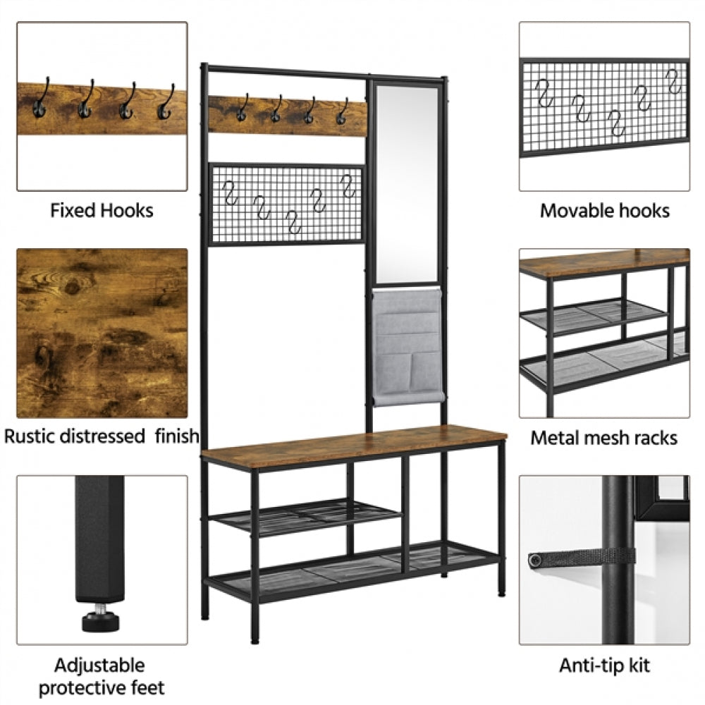This 6-in-1 multifunctional hall tree provides you with 8 fixed hooks, 5 movable S-hooks, a hanging storage bag, a 3-layer shoe changing bench that can hold up to 100 kg/ 220 lb, and a mirror, which is a tasteful and practical complementary to the entryway, foyer, mudroom, bedroom, office, etc.