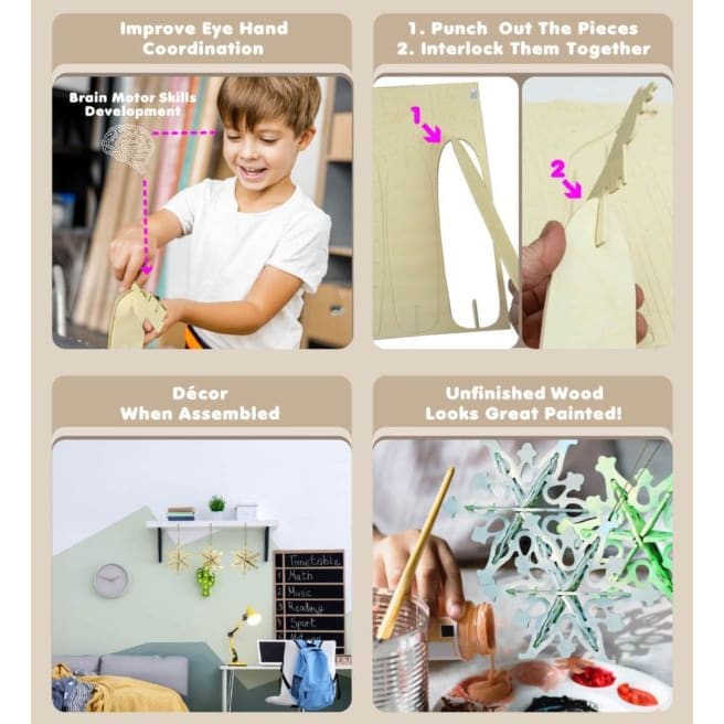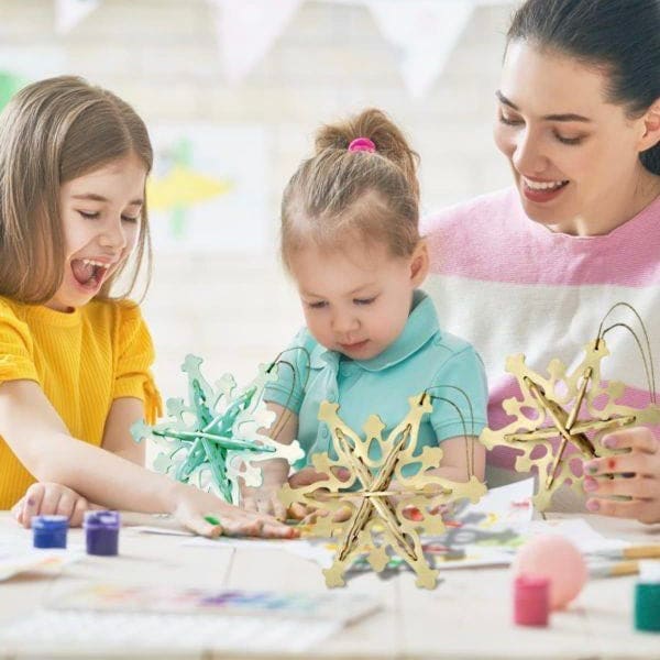 This 12 piece (set of 3) Snowflake Ornaments wood craft construction kit is a fun & educational DIY 3D puzzle to build & paint or keep in natural wood.