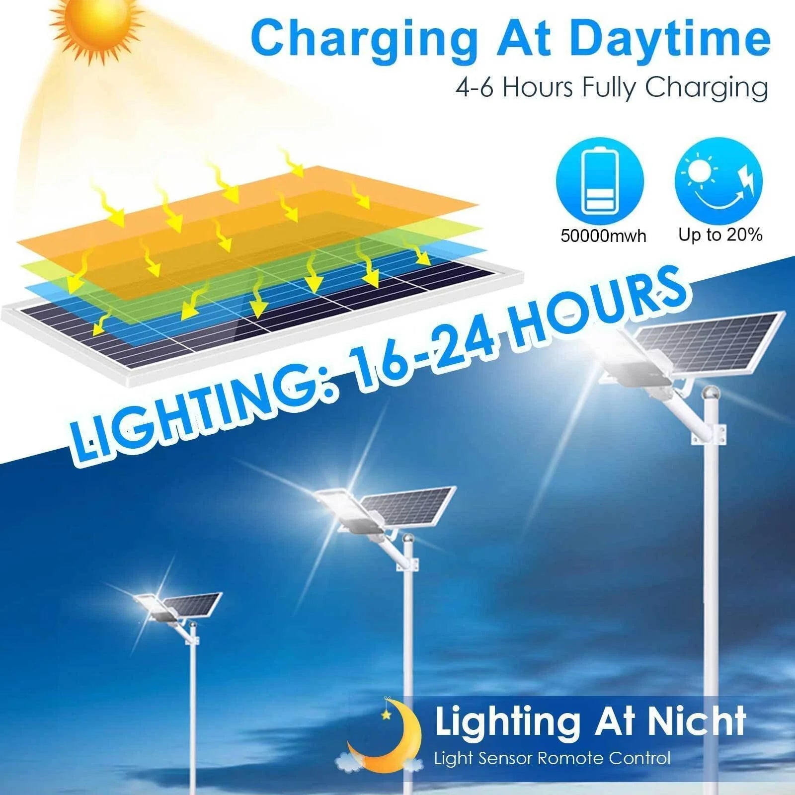 - Smart Automatic Operation: The 700W Outdoor Solar Light automatically turns on at dusk and off at dawn, offering effortless lighting control.