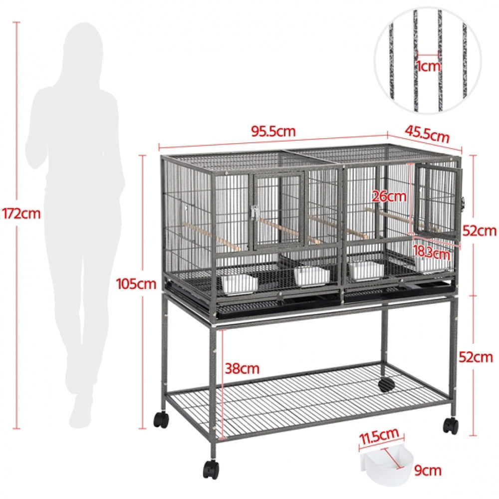 41.5’’ H divided breeder cage in water-resistant hammered paint provides you with heavy-duty wrought metal construction with pet-parent friendly features. With the included dividing grate, you can create two individual smaller bird cages or remove the dividing grate to use as one large birdcage. The cage measures 37.6’’/95.5cm long, 18’’/45.5cm wide, and 41.5’’/105cm high with 0.4’’/1cm wire spacing, which is perfect for housing 3-4 small birds such as lovebirds, canaries, finches, parakeets, cockatiels, Caiques, Quaker parrots, green cheeks, budgies.