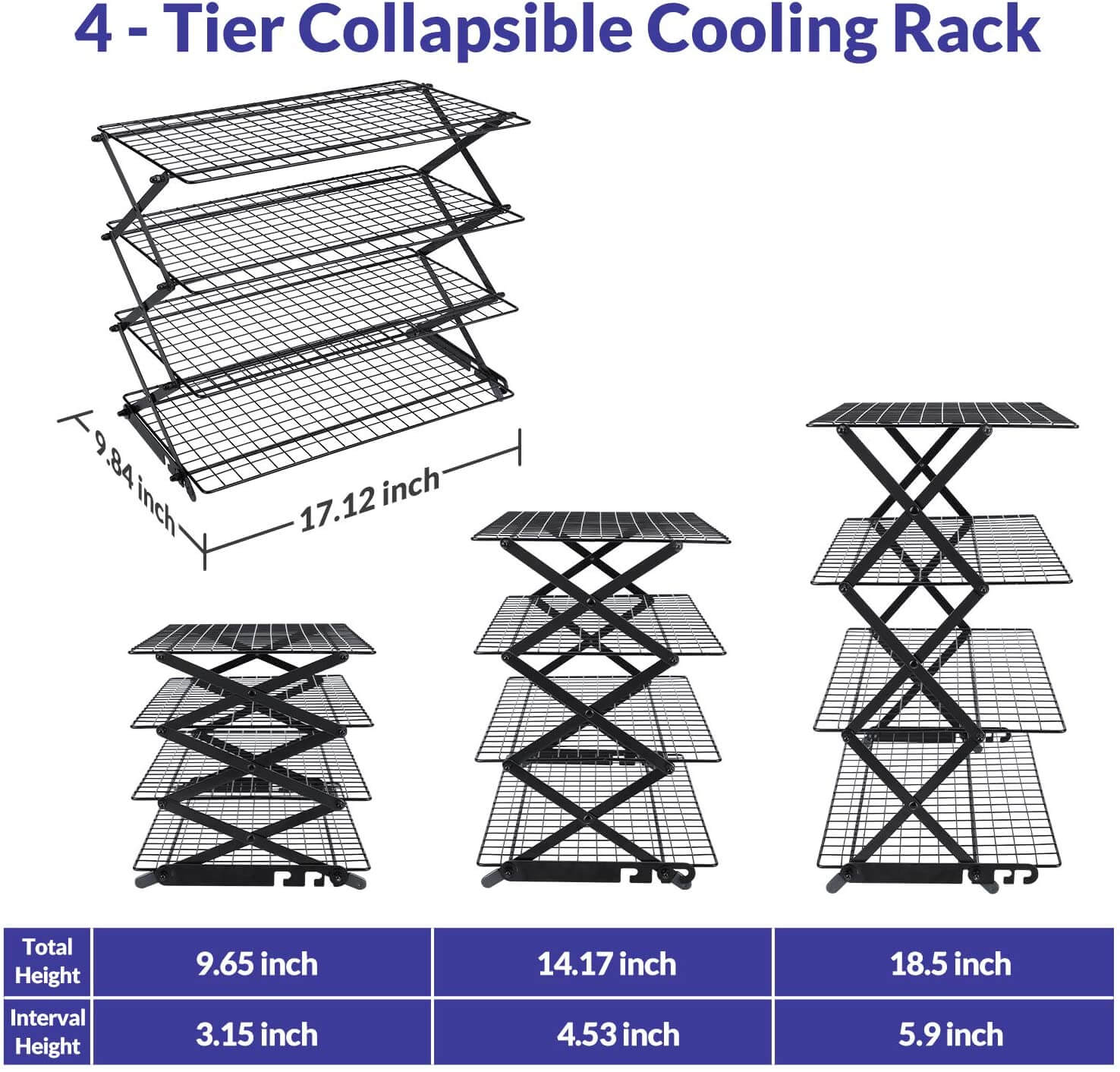 Saving Space: Collapsible for easy storage once collapsed, this 4-tier cooling rack becomes compact enough so that it stores easily and takes up less space. It comes with four tiers that stack on top of each other to take up little space while still cooling plenty of food at once. Each tier measures 17.12x9.84 inches and has a non-stick coating for easy release.