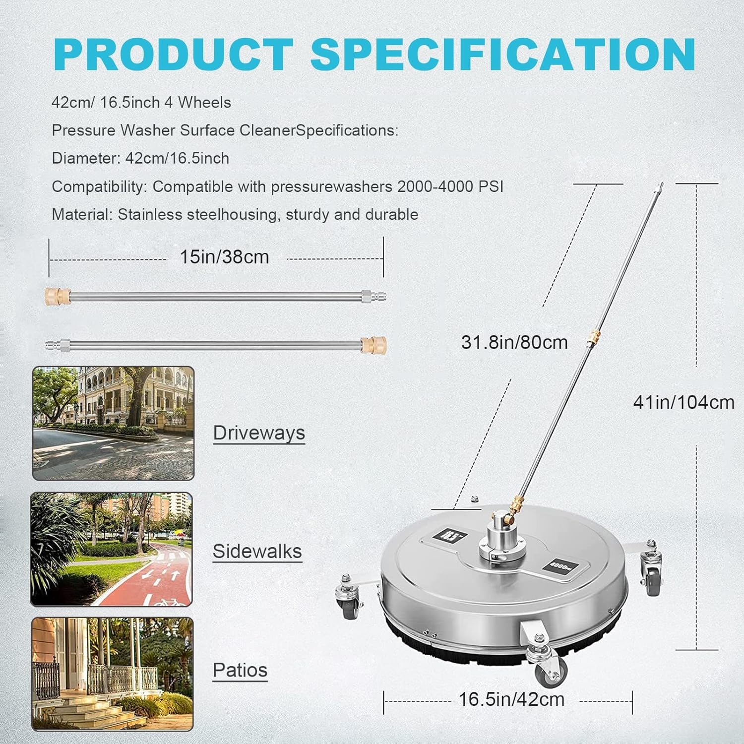 - 16.5''/18''/20'' pressure washer surface cleaner provides multiple sizes of commercial grade cleaning areas.