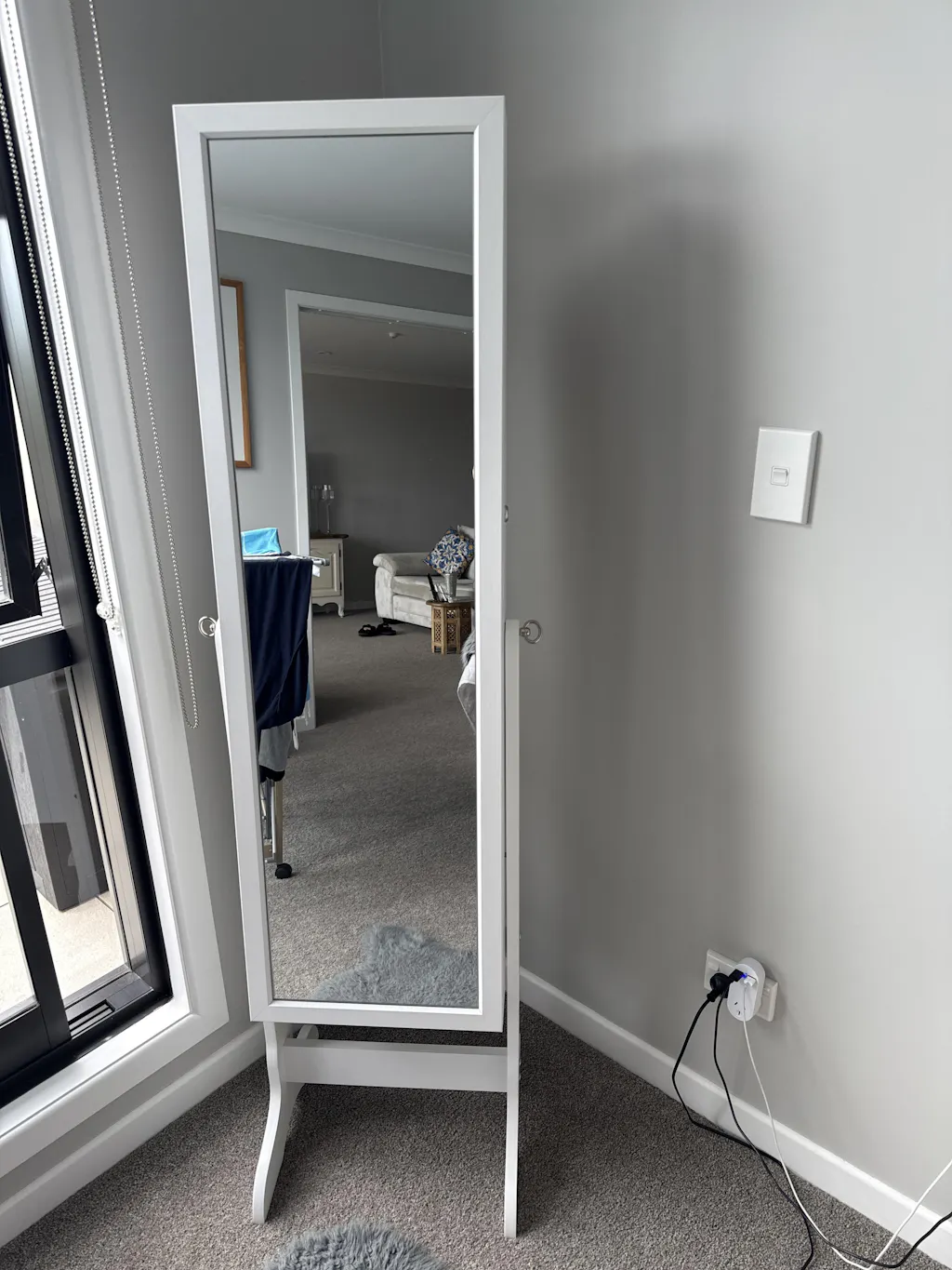 A fusion of a stylish dressing mirror and a functional storage shelf. This all-in-one solution is designed for ultimate convenience, effortlessly showcasing your jewelry from every angle.
