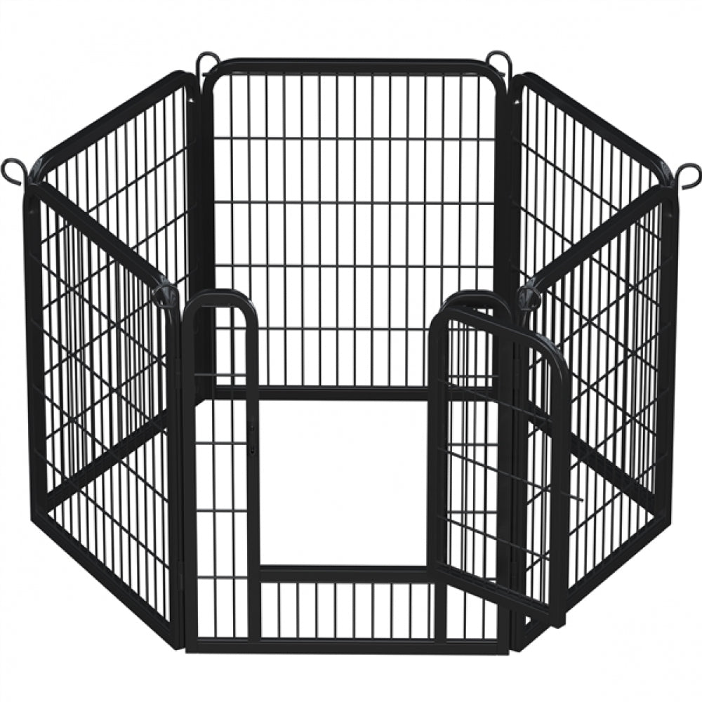 Our pet playpen boasts a premium-quality, black-finished steel construction that ensures longevity. Ideal for pets, this fence creates a secure, enclosed area with an open top for play and exercise. Use it to limit your pet's space or to keep them away from other animals. This heavy-duty playpen is suitable for dogs, ducks, rabbits, and more. It's simple to set up without requiring any tools and can be utilized indoors, during RV camping or traveling, or for other yard activities. Metal stakes connect the panels, making it easy to construct various shapes by adding or removing panels.