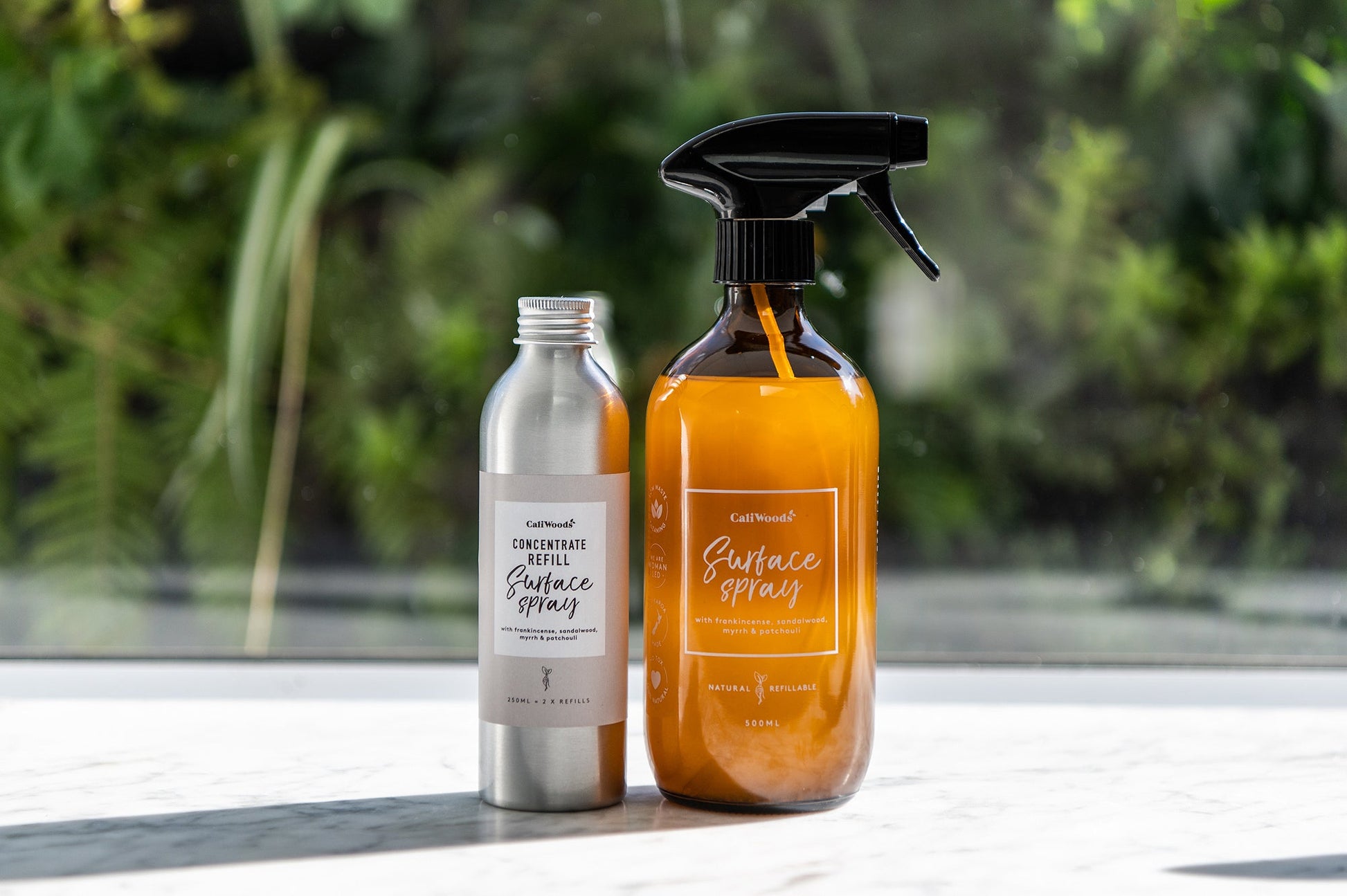 Refill your CaliWoods Surface Spray. Beautifully fragranced with Frankincense, Sandalwood, Myrrh, and Patchouli.