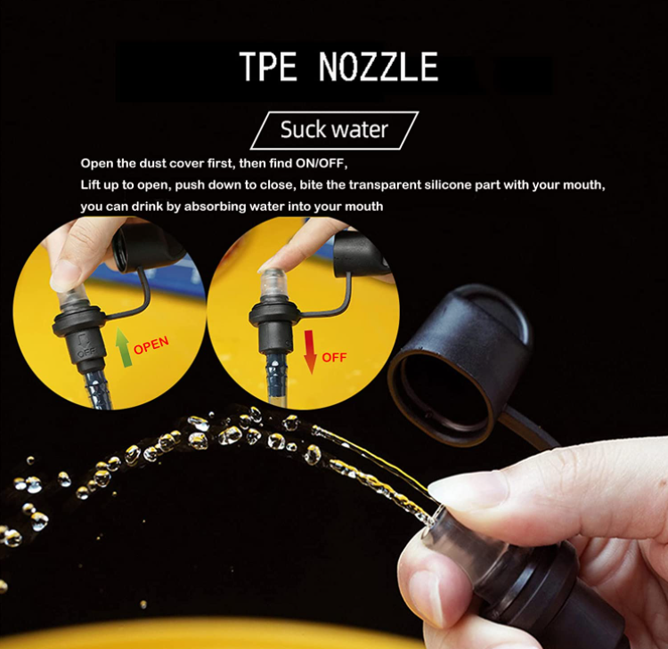 The water bag backpack is equipped with a water injection hose and a push-in bite valve, which is convenient for walking without the hassle of removing the backpack to fetch water, but drinking directly to replenish energy. Open the dust cover of the water pipe, bite the faucet with your teeth, and then gently suck out the drinking water with the force of your mouth