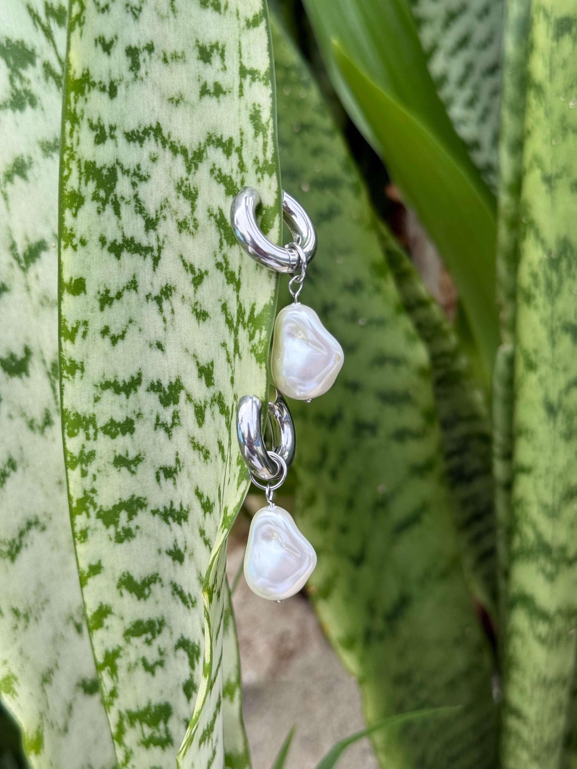 • Hine Moana Pearl Silver Huggies – Elegant baroque pearls suspended from silver hoops, embodying the feminine energy and sacred stillness of the ocean’s depths.